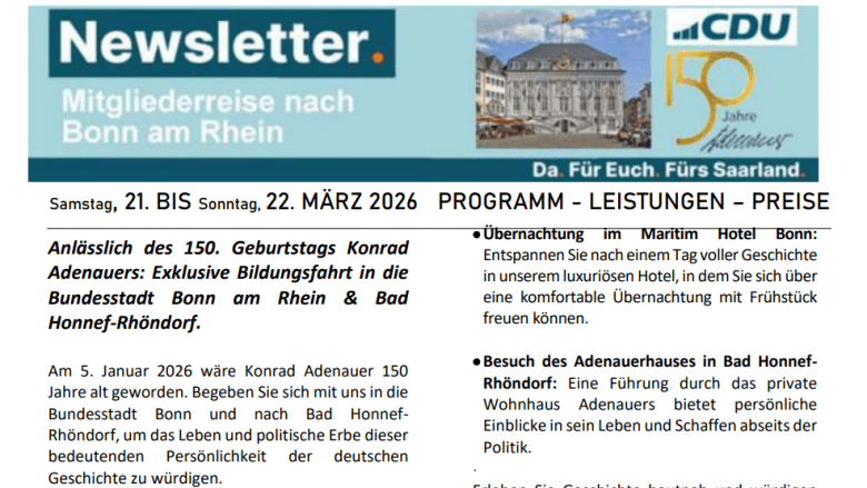 Diese Bildungsfahrt verbindet politische Bildung, Zeitgeschichte und persönliche Begegnung mit historischen Orten der Bonner Republik. Wir laden alle Interessierten herzlich ein, gemeinsam das Vermächtnis Konrad Adenauers am historischen Ort zu würdigen.