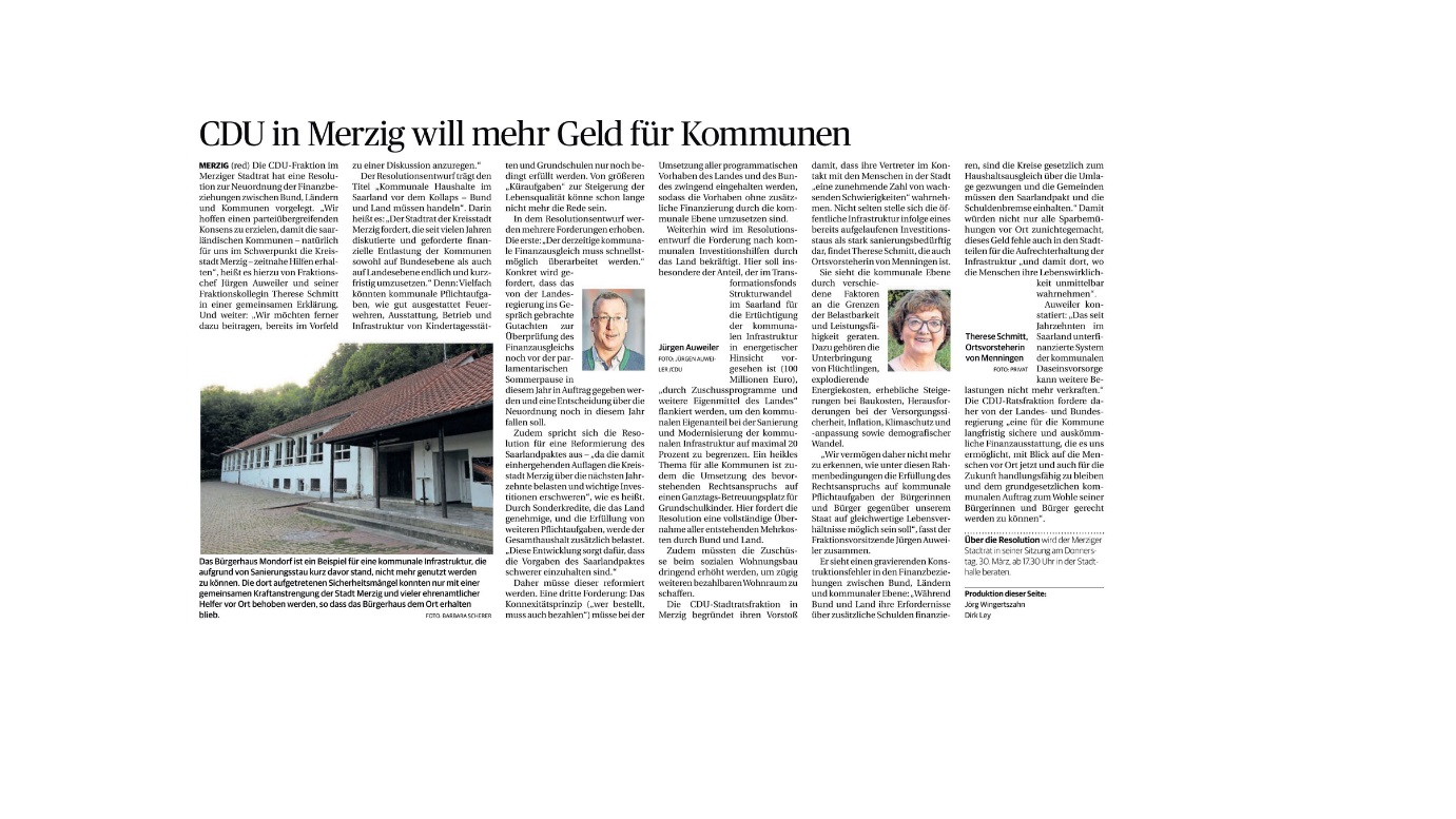 MERZIG |(red) Die CDU-Fraktion im Merziger Stadtrat hat eine Resolution zur Neuordnung der Finanzbeziehungen zwischen Bund, Ländern und Kommunen vorgelegt. „Wir hoffen einen parteiübergreifenden Konsens zu erzielen, damit die saarländischen Kommunen – natürlich für uns im Schwerpunkt die Kreisstadt Merzig – zeitnahe Hilfen erhalten“, heißt es hierzu von Fraktionschef Jürgen Auweiler und seiner Fraktionskollegin Therese Schmitt in einer gemeinsamen Erklärung. Und weiter: „Wir möchten ferner dazu beitragen, bereits im Vorfeld zu einer Diskussion anzuregen.“