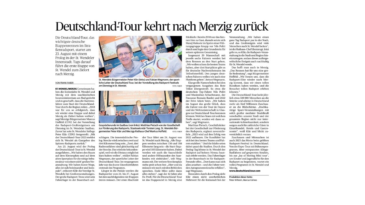 ST. WENDEL/MERZIG | Gemeinsam haben die Kreisstädte St. Wendel und Merzig mit dem saarländischen Innenministerium am Rad gedreht und es geschafft, dass die Radrennfahrer zum Start der Deutschland-Tour durch die Region rollen. „2018 war für uns so erfolgreich, dass wir wieder eine Etappe und dabei Merzig als Zielort haben wollten“, sagt Merzigs Bürgermeister Marcus Hoffeld (CDU) bei der Vorstellung des Radsport-Großereignisses am Dienstag im St. Wendeler Saalbau. Zuvor hat sein St. Wendeler Kollege Peter Klär (CDU) festgestellt: „Mit der Deutschland-Tour 2023 meldet sich St. Wendel als Gastgeber des Spitzen-Radsports zurück.“