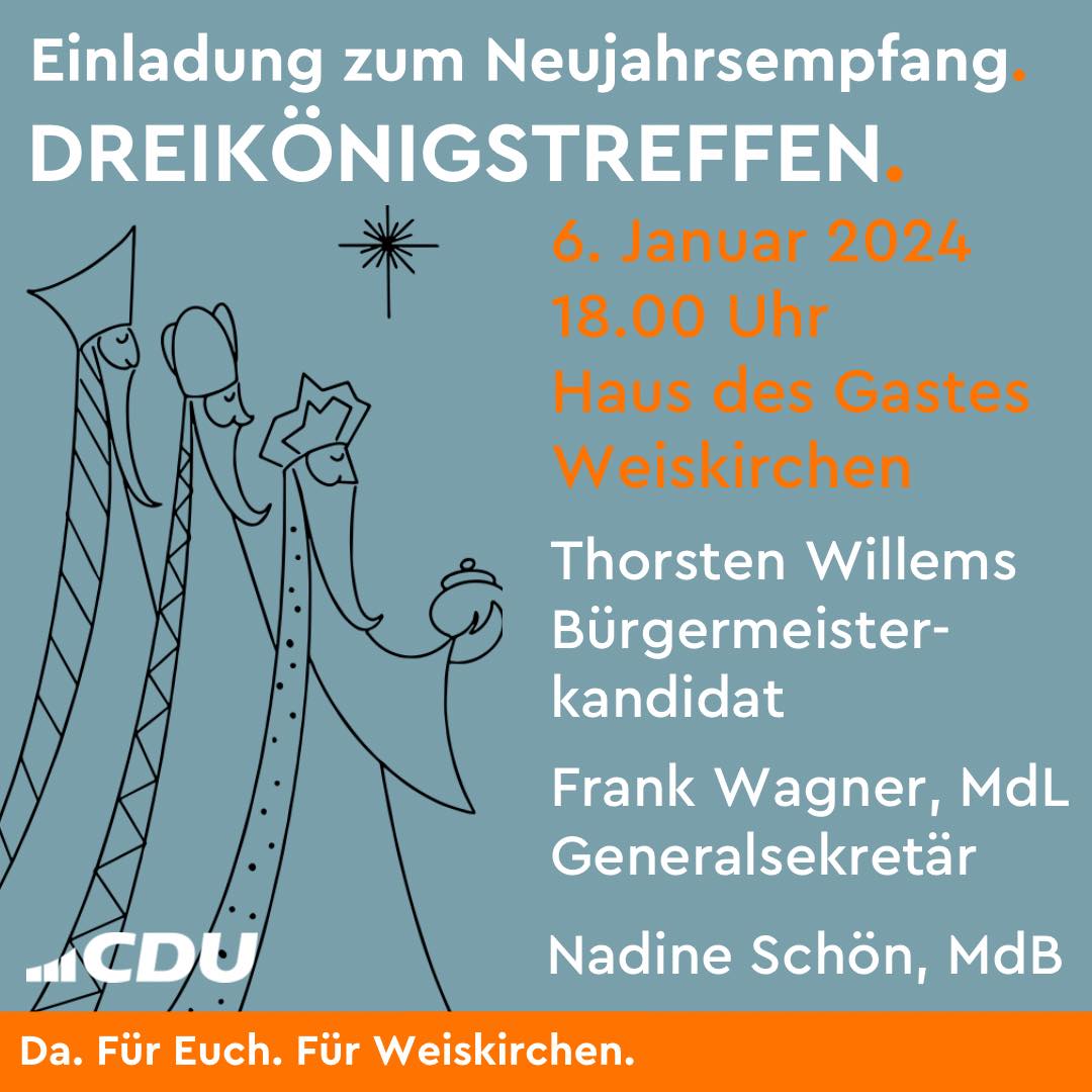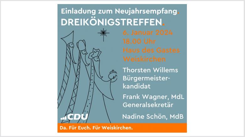 Herzliche Einladung zum Dreikönigstreffen der CDU Weiskirchen. Für eine bessere Planung Anmeldung bitte unter Kontakt [at] thorsten-willems.de