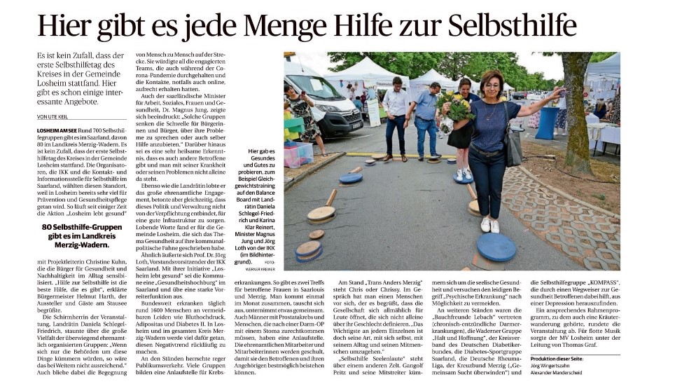 An weiteren Ständen waren die „Bauchfreunde Lebach“ vertreten (chronisch-entzündliche Darmerkrankungen), die Waderner Gruppe „Halt und Hoffnung“, der Kreisverband des Deutschen Diabetikerbundes, die Diabetes-Sportgruppe Saarland, die Deutsche Rheuma-Liga, der Kreuzbund Merzig („Gemeinsam Sucht überwinden“) und die Selbsthilfegruppe „KOMPASS“, die durch einen Wegweiser zur Gesundheit Betroffenen dabei hilft, aus einer Depression herauszufinden.