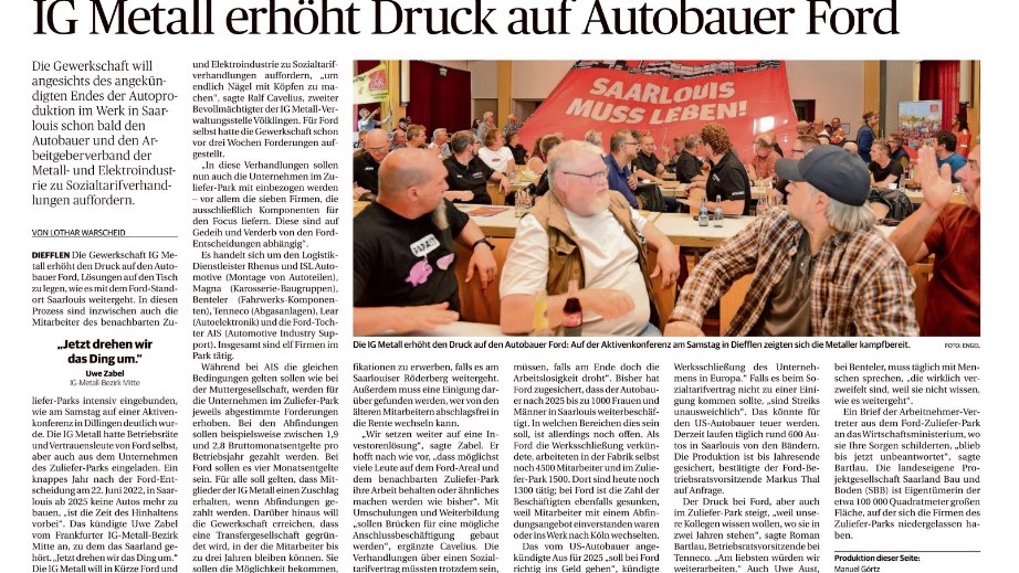 DIEFFLEN |Die Gewerkschaft IG Metall erhöht den Druck auf den Autobauer Ford, Lösungen auf den Tisch zu legen, wie es mit dem Ford-Standort Saarlouis weitergeht. In diesen Prozess sind inzwischen auch die Mitarbeiter des benachbarten Zuliefer-Parks intensiv eingebunden, wie am Samstag auf einer Aktivenkonferenz in Dillingen deutlich wurde. Die IG Metall hatte Betriebsräte und Vertrauensleute von Ford selbst, aber auch aus dem Unternehmen des Zuliefer-Parks eingeladen. Ein knappes Jahr nach der Ford-Entscheidung am 22. Juni 2022, in Saarlouis ab 2025 keine Autos mehr zu bauen, „ist die Zeit des Hinhaltens vorbei“. Das kündigte Uwe Zabel vom Frankfurter IG-Metall-Bezirk Mitte an, zu dem das Saarland gehört. „Jetzt drehen wir das Ding um.“ Die IG Metall will in Kürze Ford und den Arbeitgeberverband der Metall- und Elektroindustrie zu Sozialtarifverhandlungen auffordern, „um endlich Nägel mit Köpfen zu machen“, sagte Ralf Cavelius, zweiter Bevollmächtigter der IG Metall-Verwaltungsstelle Völklingen. Für Ford selbst hatte die Gewerkschaft schon vor drei Wochen Forderungen aufgestellt.