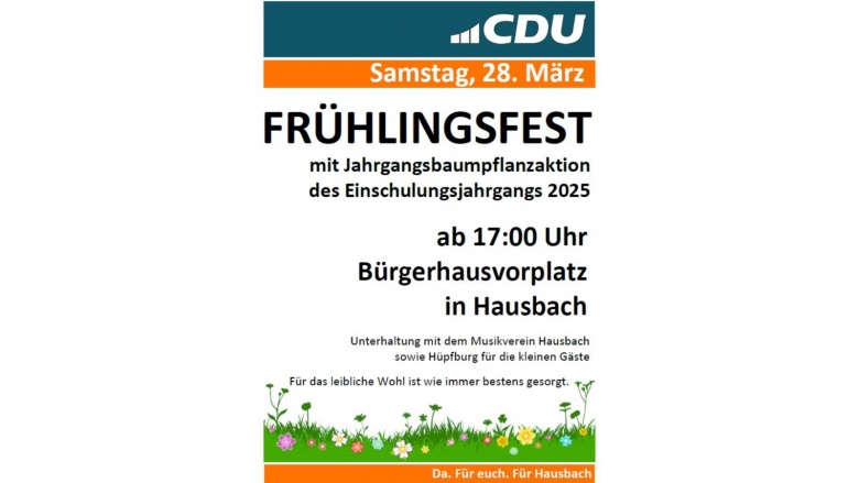 Am Samstag, den 28. März, lädt die CDU Hausbach ab 17:00 Uhr herzlich zum Frühlingsfest auf dem Bürgerhausvorplatz in Hausbach ein.